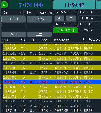 クラスタを参照すると、1時間ほど前に4U1UN 7MHz FT8(国連本部)のスポットが上がっていたので、早速当該周波数をワッチ開始。