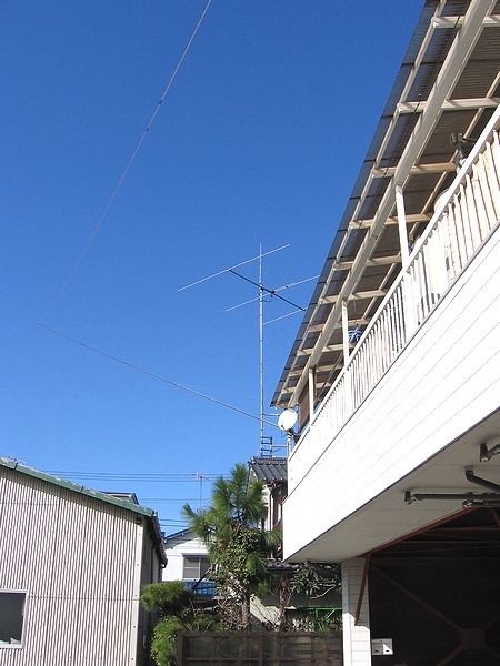 2Fベランダに展開した、アルミパイプ+ワイヤーで突き出した旗竿LW(+ATU)と、50MHzの3エレ八木。