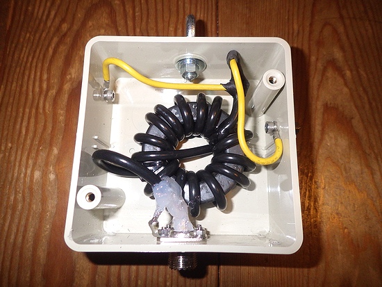手持ちのトロイダルコア(FT240-43)に3D-2V同軸をW1JR巻きしたものを、近所のホームセンターで調達した未来工業製の小型プラボックスに納めてあります。