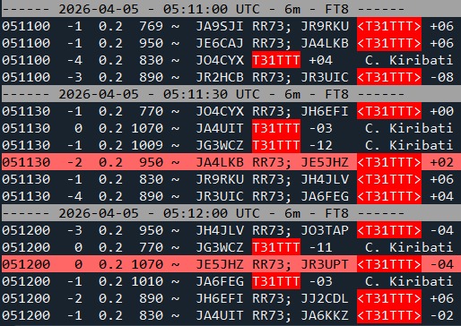 大なべのお守りをしながらHi、ちょろっと50MHzをワッチしたところ、T31TTT(キリバス共和国フェニックス諸島)が激強で入感しており、暫くコールしていたら目出度くリターンがありました。